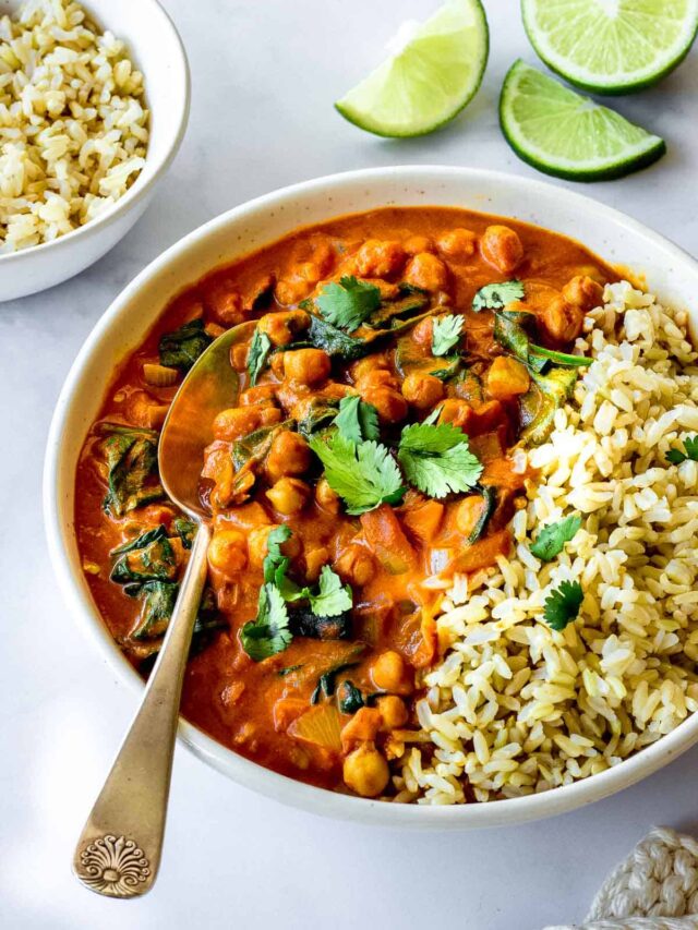 Curry is a popular vegetarian dish around the world, but many people think it takes a lot of time and special spices. This version uses pantry staples and comes together quickly. The base is made from canned chickpeas and fresh spinach, providing plenty of protein, iron, and fiber.